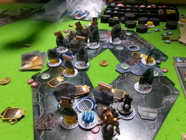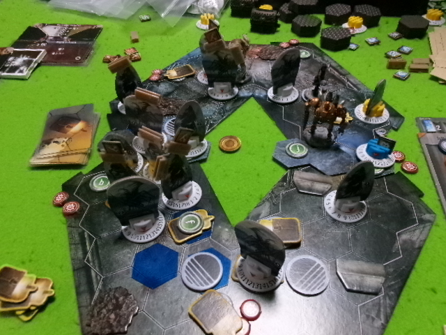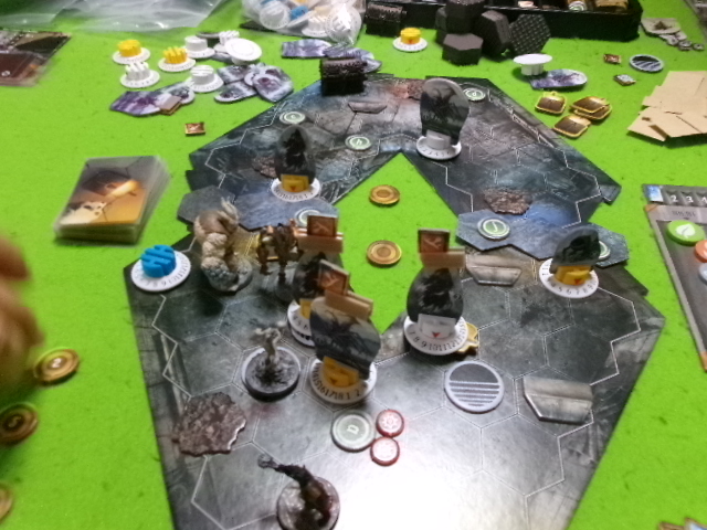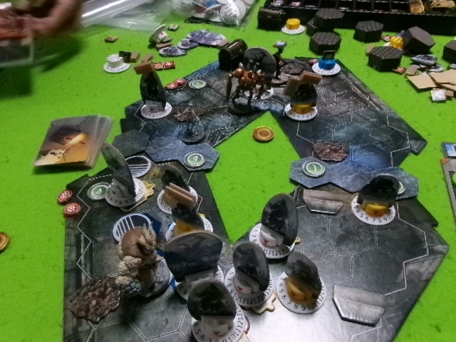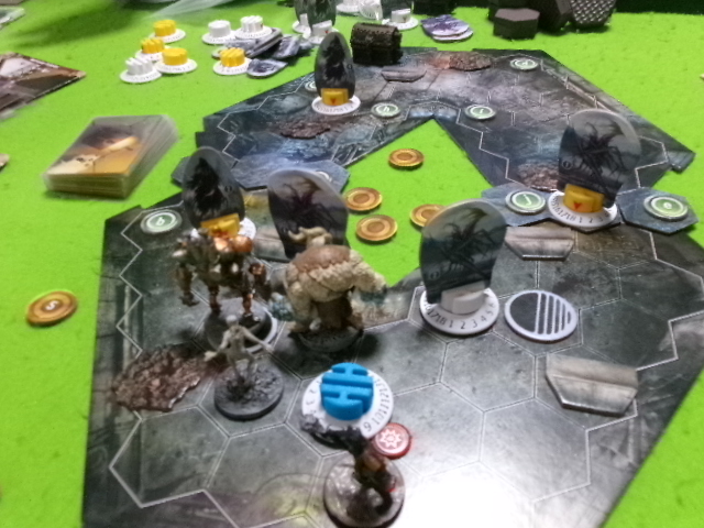 ハロワーはクレインに4ダメ、毒。フローズン・フィストは氷を置いて、周囲5体に攻撃、2〜3ダメ与えます。デスウォーカーも5体にアタック1。ポーション使って強化、+2して、5体に3〜6ダメ。カオスデーモン4体がフローズン・フィストを殴りますが、装甲2〜3と反撃で、耐えます。